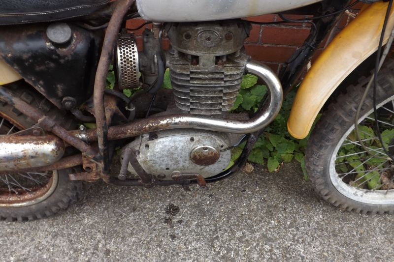 Been stood some time, engine although has some oxidisation, turns over with fantastic compression, last run approximately 10 years ago, lots of good stuff on it, professionally pineappled barrel and head, CCM yokes, air fork conversion, works type bottoms, engine built on NOS unstamped cases, frame also has no markings, original adventurer alloy tank that is clean inside and genuine trials BSA seat, capacitor discharge ignition system, QD BSA rear wheel rim has deteriorated, would probably run if you tried, no documents.