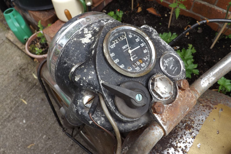Although the chrome is poor the chassis and cycle parts are good and solid, it still has the original chronometric speedometer, and lucas switch and ammeter, basically all that is missing is the engine unit and the front footrests and stand, there are no documents with it, hence price.
