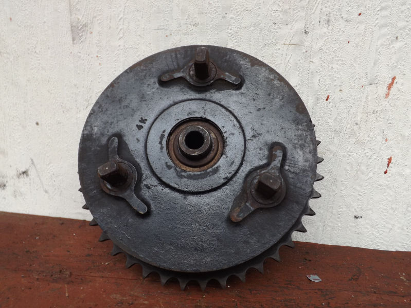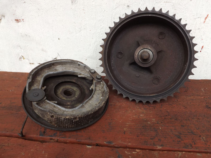 Norton Commando rear brake drum and sprocketAll complete as removed, sprocket is still good, drum still has stub axle in place, brake surface is good, brake plate still has outrigger strap and spring, shoes are ok.